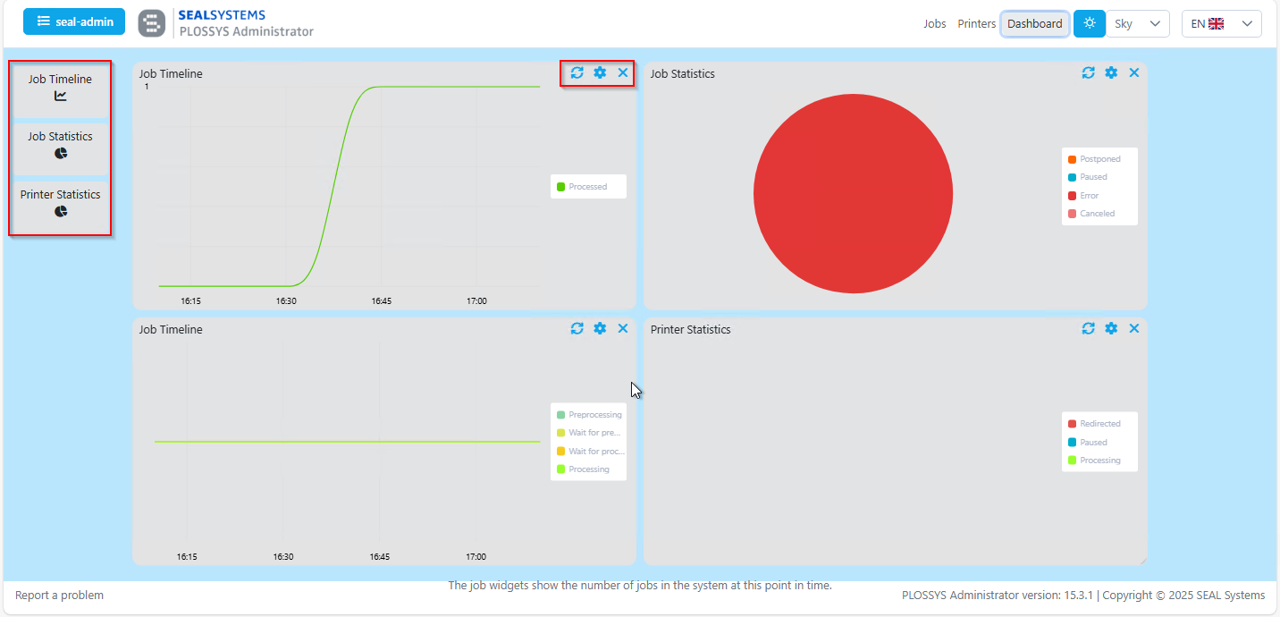 You can refresh, configure and remove each widget on the dashboard with the controls in the top right corner of it. You can add widgets by clicking the specific icon in the left column. The widgets only show statistics for the data available in the Jobs und Printers tabs of PLOSSYS Administrator at the same time. For deeper insights, use the Kibana dashboards of Elastic Stack.