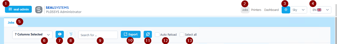 Jobstab,Printerstab andDashboard. - Switch for dark/light mode and color options for the user interface.