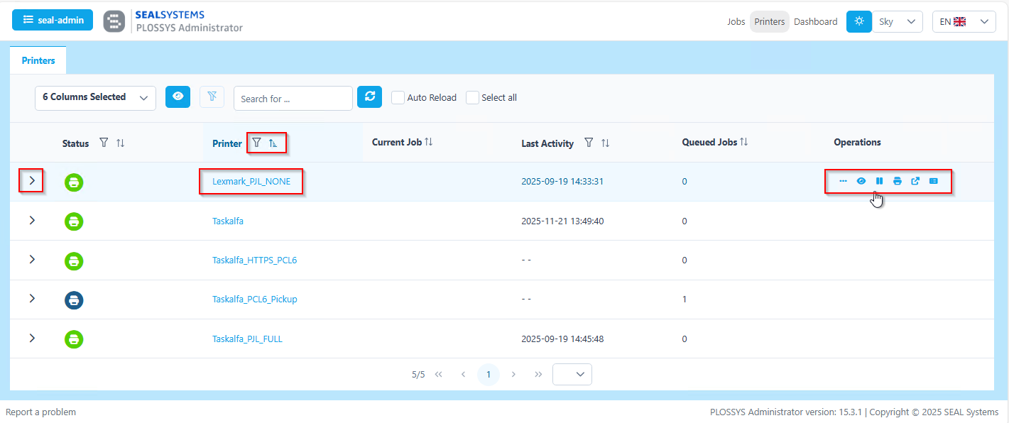 By clicking the > on the left of each printer, you can see the printer configuration and parameters.